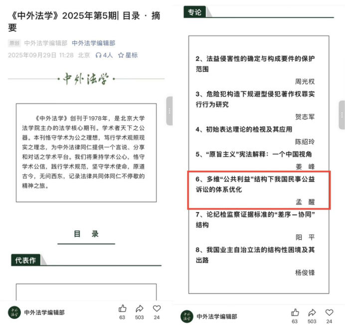 近日,辽宁大学法学院孟醒副教授的论文“多维“公共利益”结构下我国民事公益诉讼的体系优化”在《中外法学》2025年第5期刊发,该刊为CSSCI来源期刊、CLSCI全国中文法律类核心期刊(校B)。