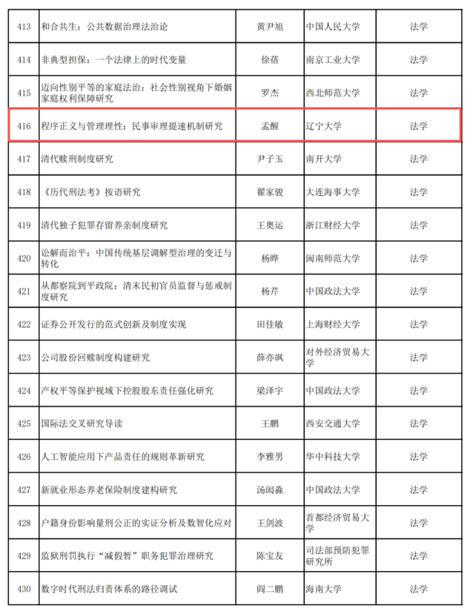 近日,全国哲学社会科学工作办公室公布了2025年国家社会科学基金后期资助暨优秀博士学位论文出版、优秀学术著作再版项目立项名单。我院孟醒副教授的《程序正义与管理理性:民事审理提速机制研究》获得2025年国家社会科学基金后期资助项目立项。