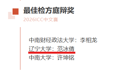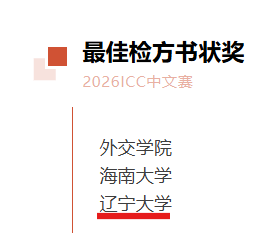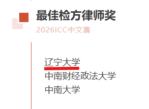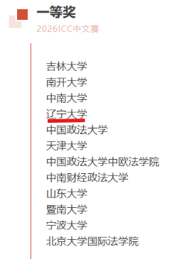 2026年国际刑事法院中文模拟法庭比赛于2026年4月10日至4月12日在中南大学线下举行。本届ICC中文赛共有来自全国各地的130支高校代表队参加,赛队数量创下自创办以来的新纪录,也标志着ICC中文赛成为国内规模最大、影响力最广的国际法模拟法庭竞赛之一。经过书状评审环节后,来自60支代表队成功晋级正赛庭辩环节。经过两天正赛庭辩环节的激烈角逐,辽宁大学法学院代表队荣获2026年国际刑事法院中文模拟法庭竞赛全国一等奖(第4名),以及最佳检方书状奖(第3名)、最佳检方律师奖(第1名)。同时,范冰倩同学获得最佳检方律师庭辩奖(第2名)。延续了辽宁大学自2018年参赛以来连续八年收获一等奖的优异成绩!